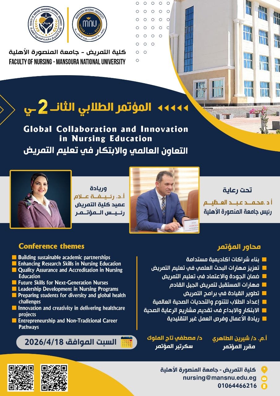 في ضوء توجه #جامعة_المنصورة_الأهلية نحو دعم التميز الأكاديمي وتعزيز الابتكار الطلابي في المجالات الصحية، تعلن كلية التمريض عن إطلاق فعاليات المؤتمر الطلابي الثاني، تحت عنوان: "التعاون العالمي والابتكار في تعليم التمريض - Global Collaboration and Innovation in Nursing Education"