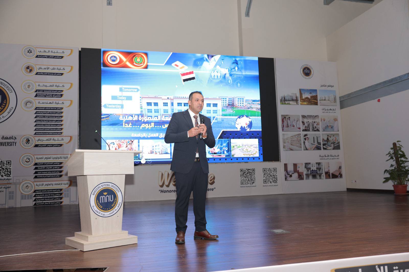 ومن جانبه، أشار الدكتور شريف خاطر إلى تجهيز جامعة المنصورة الأهلية بأحدث الوسائط التكنولوجية بما يعكس بوضوح اهتمام الدولة بتعظيم كفاءة الجامعات الأهلية، ودعمها كرافد أساسي لتطوير منظومة التعليم العالي وربطها باحتياجات التنمية وسوق العمل، مشيرًا إلى حرص الجامعة على ضمان الاستغلال الأمثل للإمكانات المتاحة، بما يحقق مستهدفات الجامعة في إعداد خريجين مؤهلين علميًا ومهنيًا، وقادرين على المنافسة في سوق العمل المحلي والإقليمي والدولي، مؤكدًا التزام الجامعة بتطبيق معايير الجودة العالمية، واستمرارها في تطوير برامجها الأكاديمية ومنشآتها التعليمية بما يدعم رؤية الدولة المصرية لبناء منظومة تعليمية حديثة قائمة على المعرفة والتكنولوجيا والابتكار.